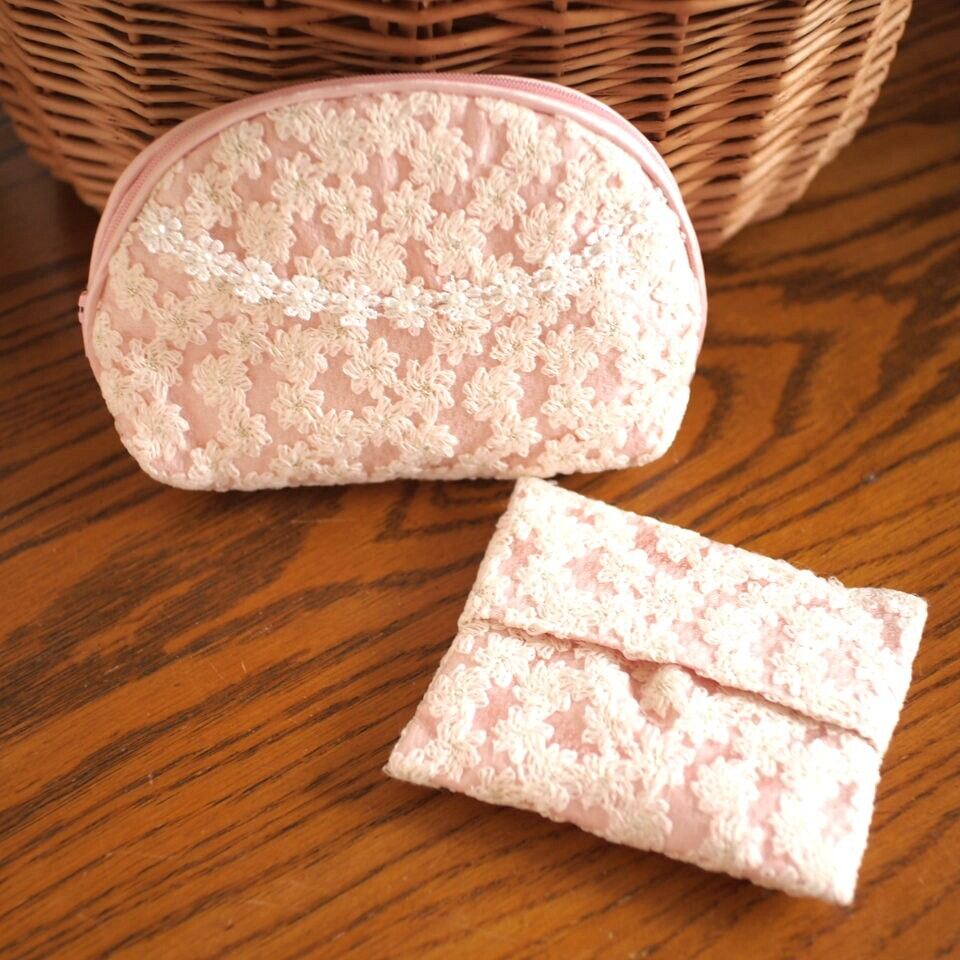 上品な小花柄の刺繡と優しいピンクの色合いが、女性らしさを引き立て、バッグの中でひときわ目を引くアイテムとなっています。