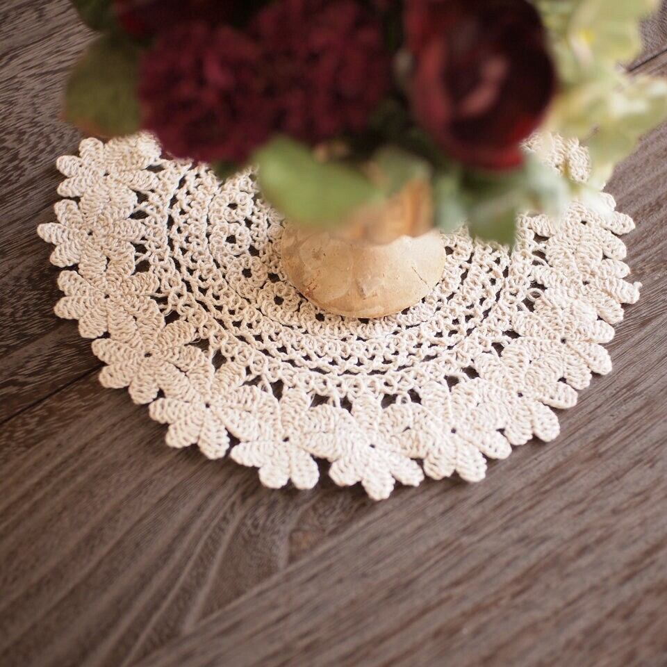 このドイリーは、マシンメイドであるため、型崩れしにくく、使いやすさが特長です。厚みのある生地と優しい風合いは、リビングやダイニング、ちょっとした場所に置くだけでおしゃれな空間を演出します。