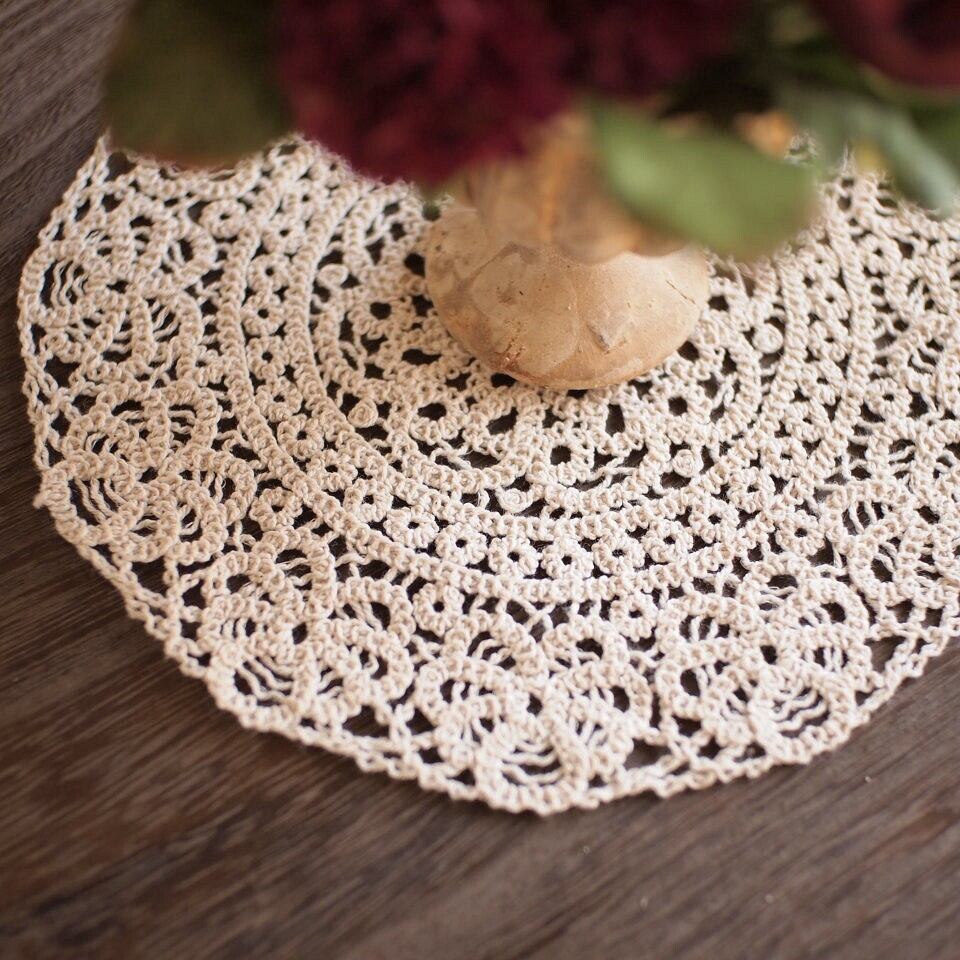 このドイリーは、マシンメイドであるため、型崩れしにくく、使いやすさが特長です。厚みのある生地と優しい風合いは、リビングやダイニング、ちょっとした場所に置くだけでおしゃれな空間を演出します。