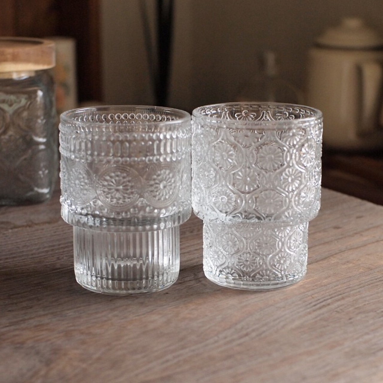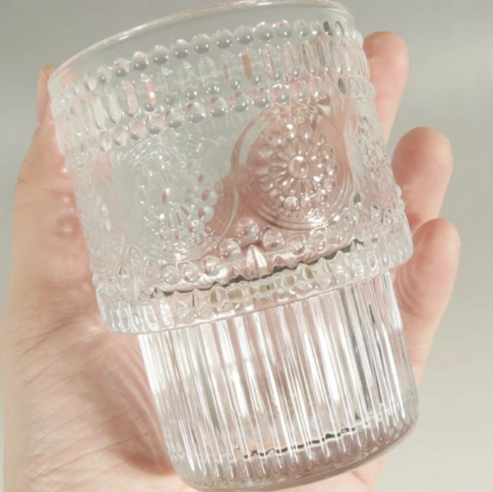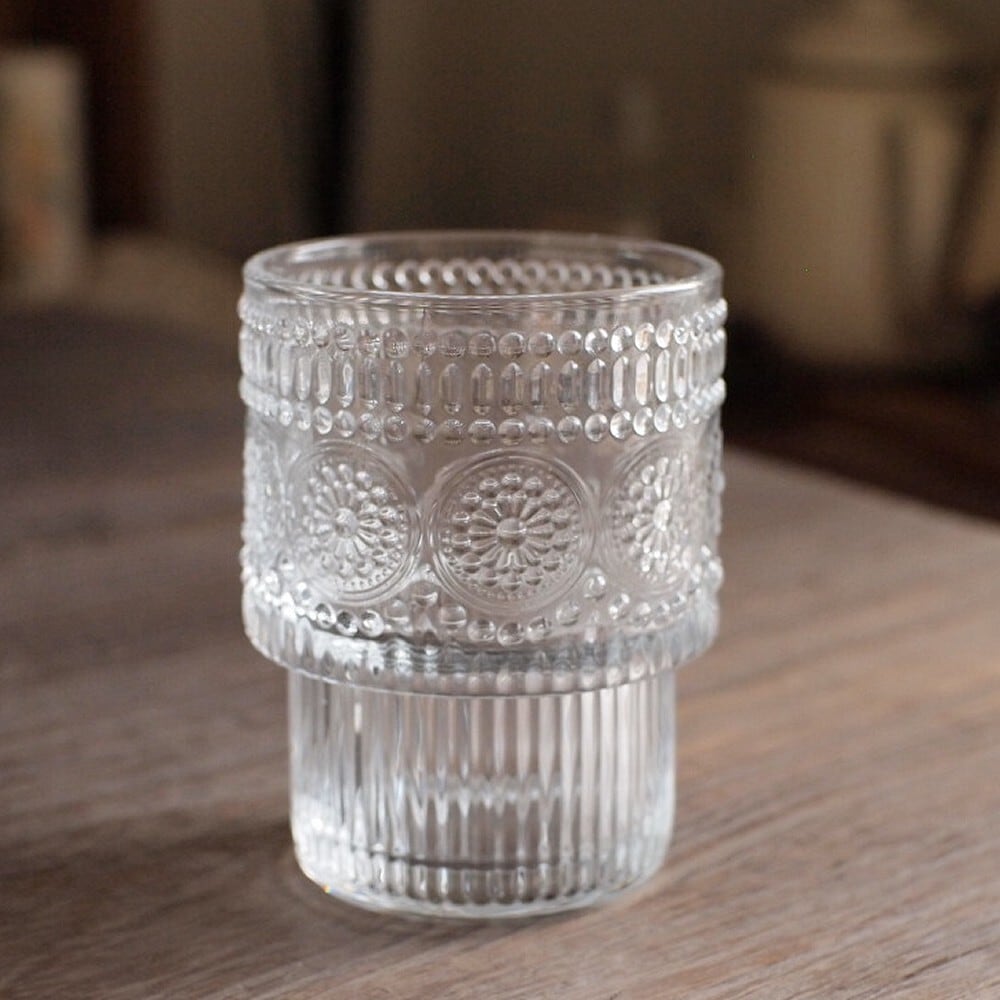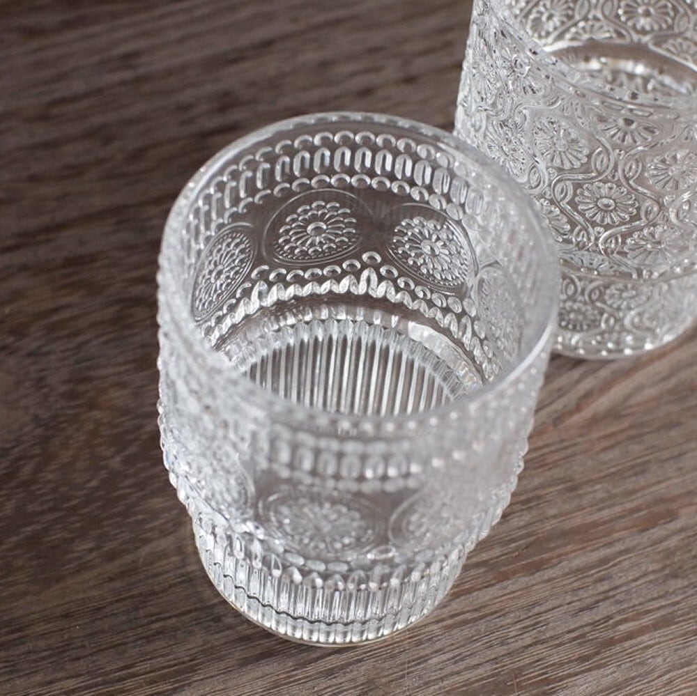 レトロな型押し模様が魅力のガラスグラス。